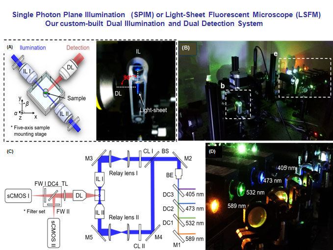 (A) The specimen is mounted at the intersection of the illumination lens (IL) with the detection lens (DL). The laser light-sheet is excited from the IL in a 2-D plane which is orthogonal to the detection axis. The SPIM system provides a long working distance with air objective lenses in comparison to water-dipping lenses in conventional light-sheet systems. (B-C) A photo and a schematic illustrate the layout of the light-sheeting imaging system. A cylindrical lens (CL) converts the laser beam to a sheet of laser light that can transversely illuminate a thin layer of the sample. The illuminated 2-D thin layer (fluorescent detection in red) is captured by the high-frame rate sCMOS camera. The filter wheels (FW I and II) in front of sCMOS cameras are used for multi-color acquisitions. (D) A photo depicts an array of laser beams aligned for multi-channel fluorescent detection. M: mirror; BS: beam splitter; BE: beam expander; TL: tube lens; DC: dichroic mirror; FW: filter wheel.