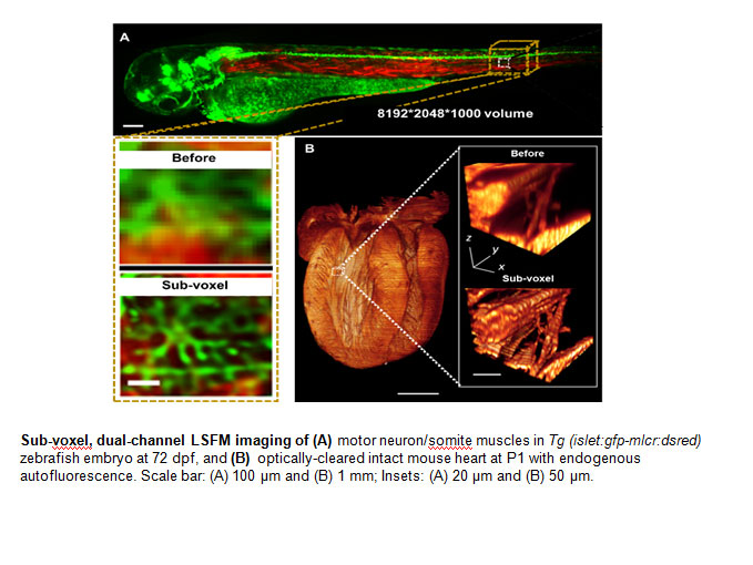 across the atrioventricular (AV) canal in a zebrafish model of cardiac development. The advent of zebrafish genetic system has enabled the application of fli1 promoter to drive expression of enhanced green fluorescent protein (EGFP) in all vasculature throughout embryogenesis8 (Tg(fli1a:EGFP)y1); thereby, allowing for 3-D visualization of the moving boundary conditions (2D + time) for computational fluid dynamics (CFD) simulation. However, 4-D (3-D + time) imaging to recapitulate the endocardium throughout the cardiac cycle requires fast tissue scanning and deep axial penetration. For these reasons, we have developed multi-scale fluorescent Super-Resolution Light-Sheet Microscopy (SRLSM) to capture the 4-D endocardial trabecular network.