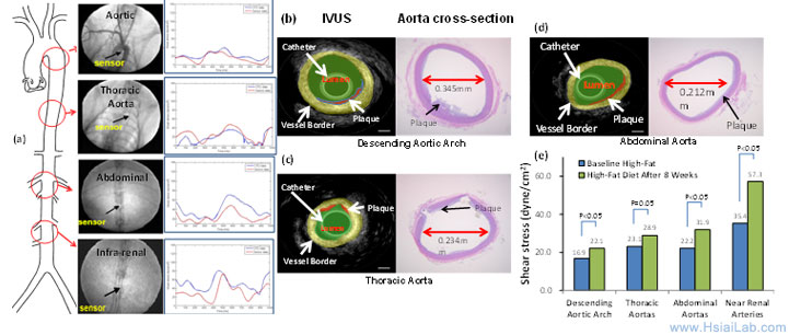 Our study revealed changes in hemodynamics and development of lesions after 8 weeks of high-fat diet. Our MEMS sensors were deployed to assess ISS in real-time (Fig. 2). Experimental ISS measurements (red) overlapped closely with those of computational fluid dynamic codes (blue) in various segments of rabbit aorta (Fig. 2a). Deployment of IVUS revealed intimal hyperplasia in relation to changes in ISS analysis (Fig. 2). High-frequency IVUS demonstrate cross sections of descending aortic arch, thoracic, and abdominal aortas with a high spatial resolution (Figs. 2b-d). The time-averaged ISS after high-fat diets increased in regions of intimal hyperplasia; thus, supporting the basis to couple ISS with EIS signals (Fig. 2e). The reason for the increase in time-averaged ISS included intimal hyperplasia, rising serum viscosity from hypercholesterolemia (data not shown), and endoluminal remodeling. In Aim 2, we will deploy the high-frequency IVUS to guide the micro-shear stress sensors and concentric bipolar microelectrodes.