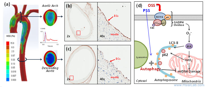 variations in shear stress. (a) The instantaneous wall shear stress is low in the lesser curvature of the aortic arch, but is circumferentially high in the descending aorta. (b) Immuno-staining reveals prominent p62 staining (arrow) in the lesser curvature where endothelial cells (ECs) were exposed to disturbed flow, including OSS. (c) p62 staining is nearly absent in the descending aorta where ECs were exposed to PSS. (d) OSS induces NADPH oxidase-mediated oxidative stress and c-Jun N-terminal Kinase (JNK) activation, leading to mitochondrial dysfunction. Sustained OSS impairs autophagic flux, leading to p62 accumulation, mtO2•- production, and mtDNA damage.)