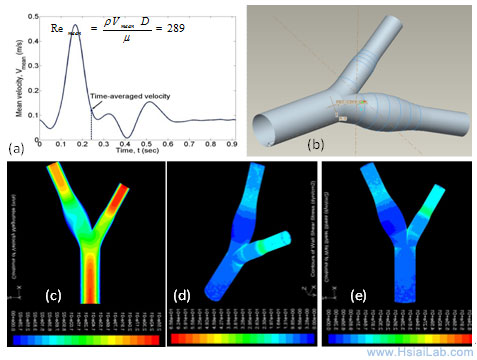 Fig. 4. A representative CFD reconstruction for the carotid artery. (a) Pulsatile flow profile derived from pulsed-wave Doppler. (b) A 3-D geometry from the mesh generation. (c) A pulsatile velocity profile. (d) - (e) Wall shear stress.