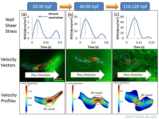 2-D moving domain CFD: We have established our 2-D simulation of endocardiac hemodynamics during cardiac development (Fig. 6). In collaboration with Prof. Alison Marsden from UCSD, we have incorporated moving-domain CFD analysis to recapitulate the changes in shear stress across the atrioventricular (AV) valves from 20 days to 120 day post fertilization (hpf). While hemodynamic shear stress is considered to be an epigenetic factor influencing vascular oxidative stress and inflammatory responses, there remains a paucity of methodologies to investigate spatial and temporal changes in endocardial shear stress during cardiac development. Thus, our innovation resides in the reconstruction of time-dependent moving endocardial boundaries and interpolation between measurements of the dynamic embryonic hearts. To reconstruct the 2-D CFD models, we have focused on the mid-plane in which blood flows through the AV canal. Recorded video was extracted frame-by-frame to track the motion of the beating hearts. Wall motion was generated by the interpolation between frames. The inlet velocity boundary condition from particle image velocity (PIV) was employed to corroborate the CFD simulation. A dramatic increase in blood velocities, wall shear stress, and heart rates developed from 20 hpf to 70 hpf (Fig. 6). Thus, we demonstrated a reasonable agreement between 2-D simulation and PIV data.