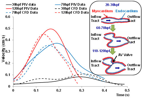Fig. 6. CFD simulation across AV canal during cardiac development. The velocity profiles were validated by comparing with those of particle image velocimetry (PIV) via the Matlab-coded PIV tool; namely, 20-30 hpf, 60-70 hpf, and 110-120 hpf. The CFD simulation overlapped reasonably with those of PIV. Noticeable are the increase in both the blood velocities and heart rates at the late stages. The inset illustrates the schematic cardiac development. At 20-30 hpf, the heart is a tube-like structure. At about 50 hpf, the heart tube is undergoing looping. At 110-120 hpf, AV cushion develops into a AV valve.