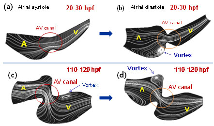 Fig. 7. Instantaneous streamlines from early to late stages. (a-b) At 20-30hpf, vortices in the morphological atrium is present in response to atrial diastole. (c-d) At 110-120 hpf, vortices are present in the ventricle during atrial systole and in the atrium during atrial diastole.