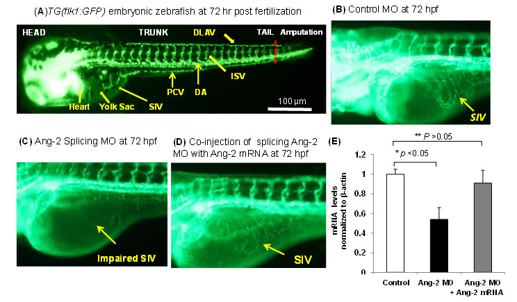 Fig. 8. Ang-2 morphant injection impaired subintestinal vein (SIV) formation in Zebrafish embryos. (A) Vasculature of transgenic zebrafish Tg (Fli-1:GFP) at 72hpf reveals subintestinal vessel (SIV), intersegmental vessel (ISV), dorsal longitudinal vein (DLAV), dorsal aorta (DA), and posterior cardinal vein (PCV). (B) Embryos injected with the control MO developed normal SIV at 72 hpf. (C) Ang-2 splicing MO injection (0.3 µm) impaired SIV formation. (D) Co-injection of Ang-2 mRNA with Ang-2 MO rescued SIV formation. (D) Ang-2 mRNA expression was significantly down-regulated in response to Ang-2 splicing MO injection at 72 hpf (*p < 0.05, n=6). Co-injection with Ang-2 mRNA (25ng) rescued Ang-2 mRNA expression (**p > 0.05, n=6).