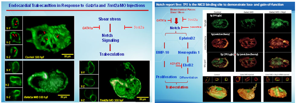 Overall, we provide the first evidence that hemodynamic shear stress modulates cardiac trabeculation via Notch signaling. Integration of 4-D light-sheet imaging with the genetically engineered zebrafish system provides a dynamic model to establish a fundamental direction at the interface of biomechanical forces and cardiac development. We demonstrate the fundamental significance of blood flow underlying cardiac architecture and function relevant to non-compaction cardiomyopathy in congenital heart disease.