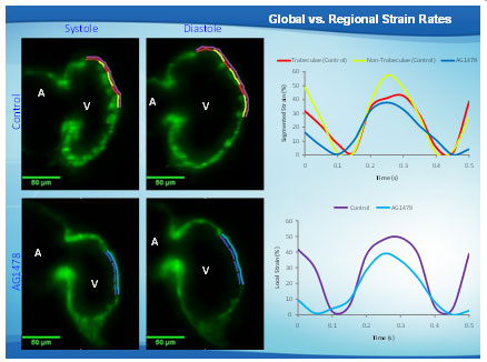 Regional strain measurements. (A) Trabecular (yellow lines) and non-trabecular (red lines) regions from controls as well as their combined myocardial segment (purple lines) are illustrated at end-systole and end-diastole. (B) ErbB signlaing inhibitor (AG1478) treatment inhibited trabeculation. Non-trabeculated myocardium (dark blue lines) and the combined myocardial segment (sky blue line) are illustrated at end-systole and end-diastole. (C) Segmental strain curves from trabeculated control regions (red lines), non-trabeculated control regions (yellow lines) and AG1478–treated non-trabeculated regions (dark blue lines) are illustrated. (D) Comparing the combined strain between controls (purple) and AG1478 treatment (sky blue) illustrates the a decrease in contractility in response to AG1478.
