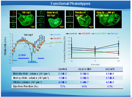 Effects of trabeculation on strain and fractional shortening. Strains were depicted at (A) 50 hpf, (B) 75 hpf, and (C) 100 hpf in response to AG1478 treatment and gata1a MO injection. (C) Significant decrease and delay in strain were observed in response to AG1478 (red) and gata1a MO (green) as compared with the WT (control, black) at 100 hpf. Coinjection of Nrg1 mRNA (blue) with gata1a MO improved strain at 100 hpf. (D) AG1478 and gata1a MO significantly decreased fractional shortening at 100 hpf. Coinjection of Nrg1 mRNA with gata1a MO improved FS. (E and F) Integrating 4D synchronization algorithm with SPIM revealed that AG1478 and gata1a MO groups developed increased ESV and EDV.