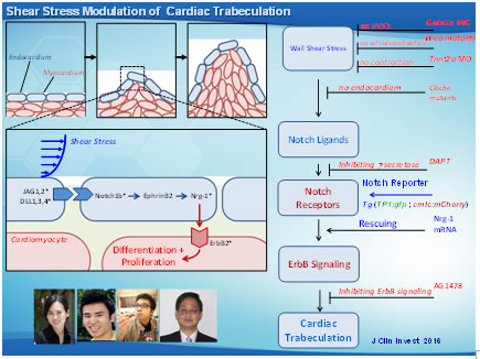 Hemodynamic forces such as shear stress are intimately linked with cardiac morphogenesis. Mutations in Notch signaling components result in congenital heart defects in humans and mice. During heart development, the myocardium differentiates into two layers, an outer compact zone and an inner trabeculated zone. The trabeculae form a network of branching outgrowths from the ventricular wall,3 and both trabeculation and compaction are essential for normal cardiac contractile function. Hemodynamic shear stress induces vascular endothelial Notch signaling, and Notch pathway mediates differentiation and proliferation of trabecular myocytes. Our multi-disciplinary approach has demonstrated that peristaltic contraction of the embryonic heart tube produces time-varying shear stress
